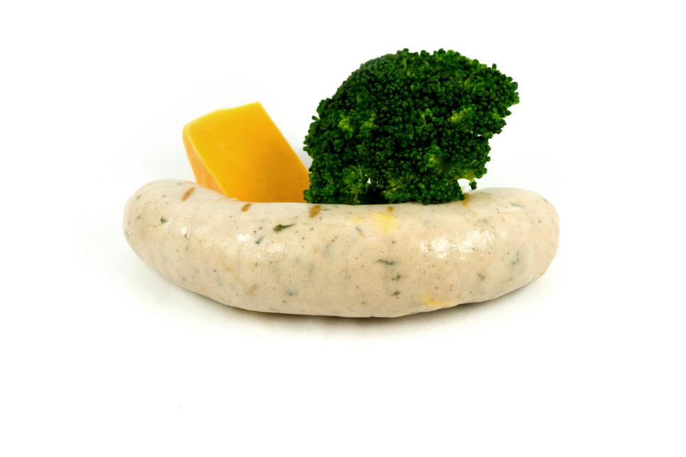 Saucisse de porc farcie de fleurons de brocoli et de morceaux de cheddar doux.