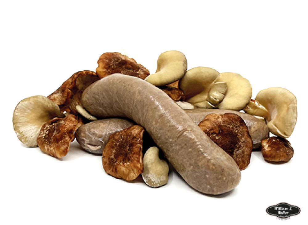 Saucisse de porc parfumée d’un coulis de champignons ainsi qu’un mélange de champignons.