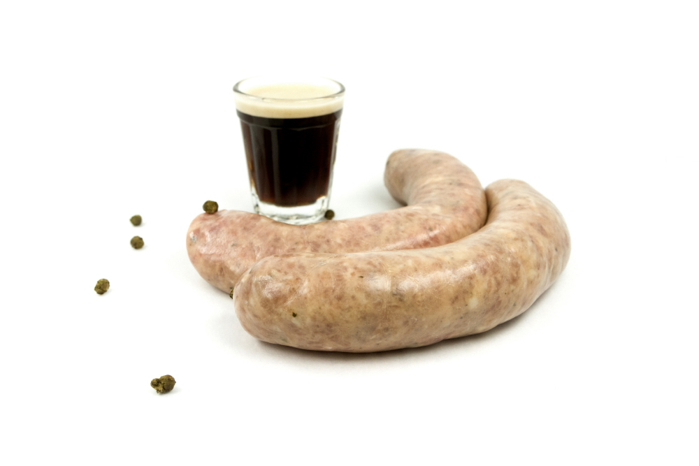 Saucisse de sanglier rehaussée de bière stout et de poivre vert.
