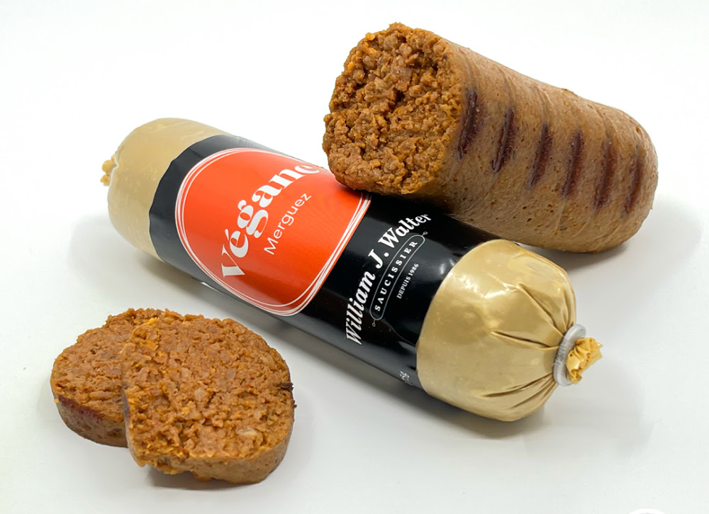 Saucisse faite à base de protéine de soya texturée, relevée d’un mélange de harissa maison et d’ail.